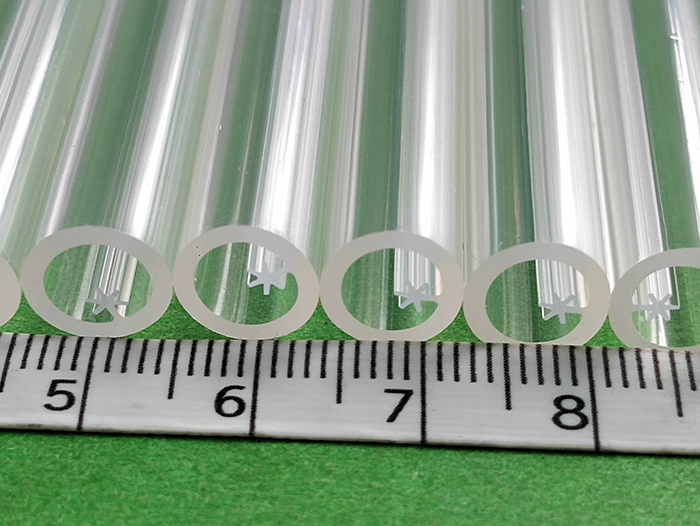 血液袋专用PVC医疗管,内五角星为95度,外圆为80度,外径为9mm,内径为6.1mm,长度245mm适用范围:健身器材、医疗配件等